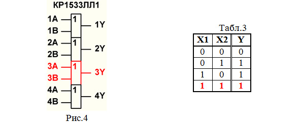 2. Составляем таблицу истинности элемента 2ИЛИ (табл.3). Этот элемент имеет 2 входа, поэтому в таблице истинности будет 22=4 строки. Напомним, что элемент 2ИЛИ выполняет логическое сложение 2 сигналов Х1,Х2.