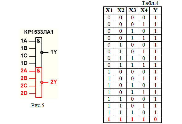 4. Составляем таблицу истинности элемента 4И-НЕ (табл.4). Этот элемент имеет 4 входа, поэтому в таблице истинности будет 24=16 строк. Напомним, что элемент 4И-НЕ выполняет логическое умножение 4 сигналов Х1,Х2, Х3, Х4 с последующим инвертированием полученного результата.