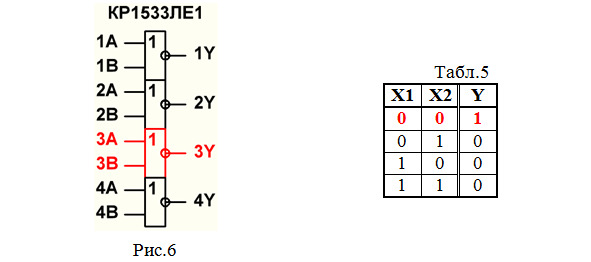6. Составляем таблицу истинности элемента 2ИЛИ-НЕ (табл.5). Этот элемент имеет 2 входа, поэтому в таблице истинности будет 22=4 строки. Напомним, что элемент 2ИЛИ выполняет логическое сложение 2 сигналов Х1,Х2 с последующим инвертированием полученного результата.