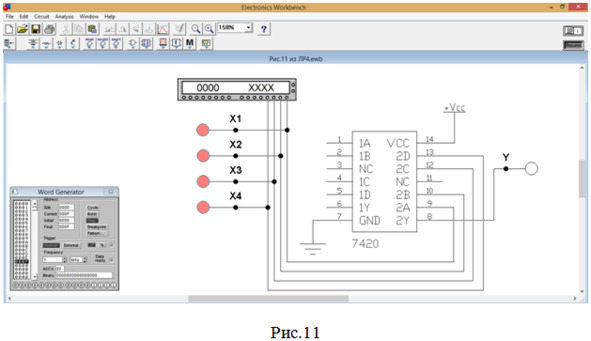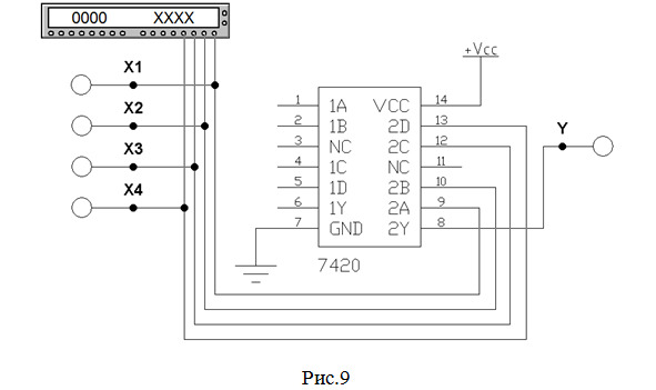 5. Собираем схему (рис.9) для исследования работы микросхемы SN74ALS20А фирмы «Texas Instruments Inc.» (российский аналог – микросхема КР1533ЛА1), содержащей 2 элемента 4И-НЕ. Будем использовать 2-й элемент данной микросхемы согласно табл.2 (выделен красным цветом на рис.5).