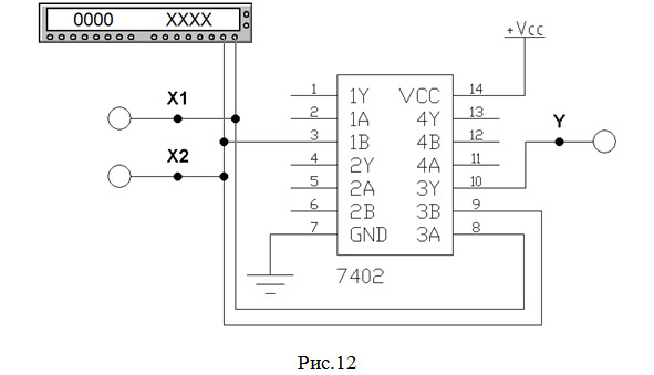 10. Собираем схему (рис.12) для исследования работы микросхемы SN74ALS02 фирмы «Texas Instruments Inc.» (российский аналог – микросхема КР1533ЛЕ1), содержащей 4 элемента 2ИЛИ-НЕ. Согласно табл.1 используем 3-й элемент данной микросхемы (выделен красным цветом на рис.6).