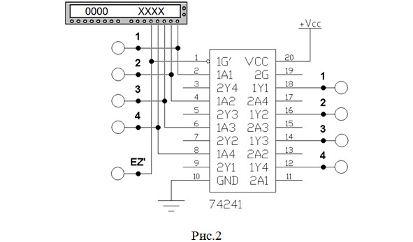 4. Собрать схему (рис.2) для исследования работы микросхемы SN74ALS241А фирмы «Texas Instruments Inc.» (российский аналог – микросхема КР1533АП4), содержащей два четырехразрядных магистральных передатчика, каждый из которых имеет по четыре буферных повторителя с тремя состояниями и повышенным коэффициентом разветвления. Примечание: в схеме на рис.4 используется 1-й передатчик данной микросхемы. Учащиеся применяют тот передатчик, номер которого определяется по табл.3.