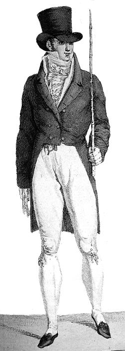Парижанин 1807 г. во фраке и шелковых кюлотах. Широкий шейный платок из белой материи закрывает шею до щек. Journal des Grus und der Moden, Weimar, 1807