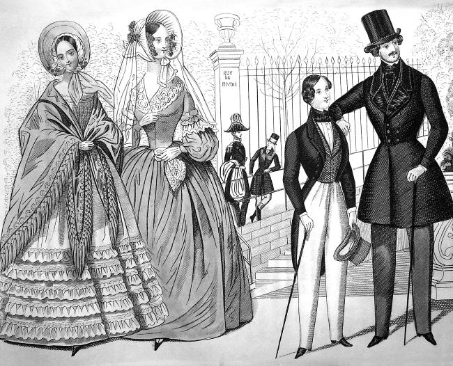 В конце XVIII века в Англии появился новый тип мужчины – денди. То есть щеголь, изысканно одетый человек, для которого костюм является предметом постоянных забот. Денди придавали серьезное значение качеству кроя, посадке костюма на фигуре. Они ввели моду на ослепительно белые рубашки. Жилеты и галстуки меняли по нескольку раз в день. Большое значение придавали обуви, перчаткам и другим аксессуарам. Начало XIX столетия – это бесспорное господство денди, которое длилось почти целый век, несколько видоизменяясь. Главным же событием мужской моды явилось формирование ко второй половине XIX века мужского европейского костюма. Одеждой городского мужчины стали универсальные классические формы – фрак, сюртук, редингот, длинные брюки, жилет, рубашка. После этого мужской костюм значительно не менялся. Капитализм внес свои коррективы в моду. Костюм освободился от декоративности и многоцветности, стал своего рода униформой с господством классических цветов – черного, белого, серого, коричневого и их сочетаний. Главный мужской образ XIX века – промышленник и предприниматель, представитель формирующегося нового класса – буржуазии. Его активность, деятельное участие в прогрессивных преобразованиях, открытии предприятий, строительстве железных дорог, налаживании банковской деятельности, торговли и т. п. требовали удобного функционального костюма из добротных тканей. Он должен был выглядеть достойно и элегантно, но богатство не должно быть кричащим. Таким требованиям соответствовал английский стиль. Лучшим материалом для мужского костюма стало высококачественное англиийское сукно. В течение XIX века изменения касались только особенностей кроя, модных деталей и аксессуаров. Лишь представителям рабочего класса и мелкой буржуазии было позволительно носить яркий галстук или узорчатый жилет. Любопытный факт, что Ч. Диккенса и Б. Дизраэли упрекали в 1840-х годах за чересчур яркие и украшенные жилеты, а позже, в 1870-х портреты обоих использовали для цветных иллюстраций с модными образцами одежды.