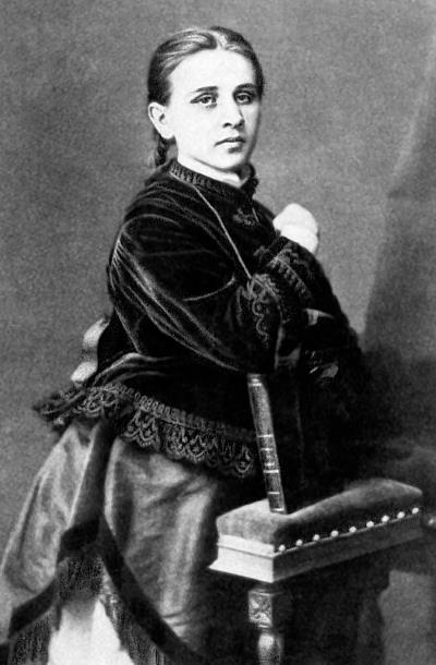 Актриса П. Стрепетова в бархатном жакете, расшитом тесьмой, оперлась о книгу. Чтение – любимое занятие девушек XIX века