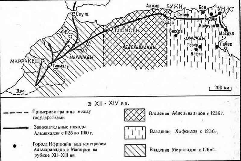 В том же XI столетии начались миграции в направлении с запада на восток, в результате чего образовались одна за другой империи Альморавидов[18] и Альмохадов[19]. Первая из них, зародившаяся в Сахаре, протянулась с юга на север: от места, где ныне расположен город Нуакшот, до подножия Пиренеев, причем ее восточная граница в Северной Африке пролегла на юг примерно у маленького тогда городка Алжир, а вторая, зародившаяся в горах Высокого Атласа, охватила весь Магриб, вместе с Андалусией («мусульманской Испанией») от Атлантического океана до египетских пределов.