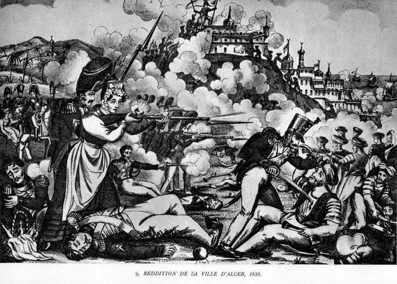 Битва за город Алжир 27 июня 1830 года (художественная картина). Легенда гласит, что в битве приняла участие француженка-торговка, бросившая наземь корзинку с товаром, чтобы взяться за ружье. Источник: Julien Ch.-A. Histoire de l’Algérie contemporaine. Paris: PUF. 1964.