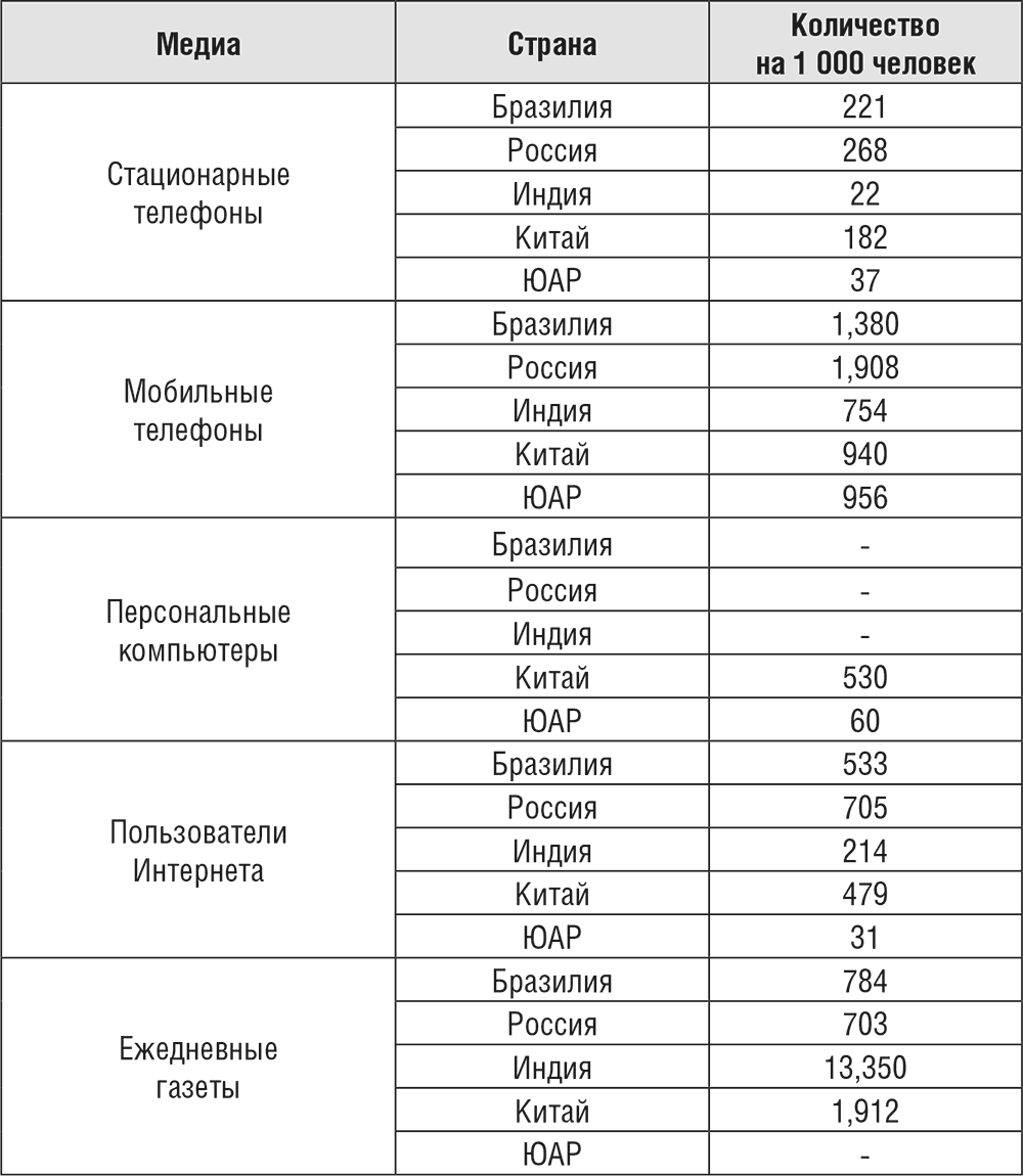 Данные Таблицы 1 свидетельствуют, что сегодня по ключевым индикаторам цифровой медиаиндустрии Россия в контексте одного из самых известных геополитических союзов – БРИКС – выглядит вполне устойчиво, сохраняя результаты своего «цифрового рывка» в 1990 – 2000-х гг.