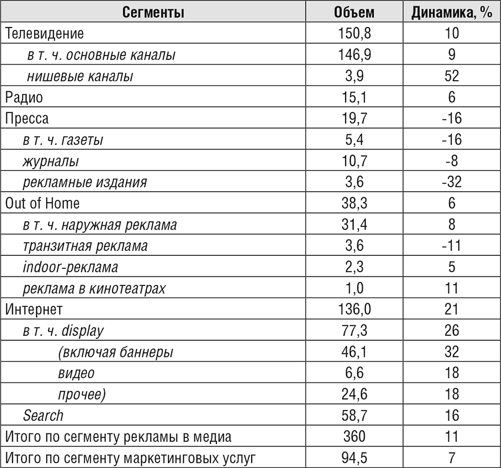 Важнейший индикатор экономического состояния СМИ – рекламный рынок. По объему рекламного рынка Россия входит в топ-10 европейских рекламных рынков. В 2016 г., по данным АКАР (см. Табл. 2), суммарный объем рекламы (без НДС) достигал 360 млрд руб., что на 11 % больше, чем годом ранее, объем сегмента маркетинговых услуг – почти 95 млрд руб., что примерно на 7 % больше, чем в 2015 г.