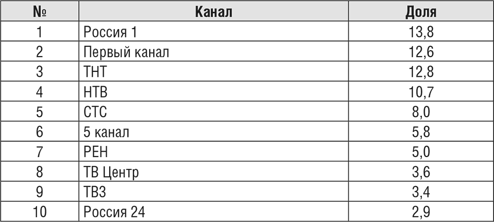 Таблица 3. Среднесуточные доли ведущих федеральных телеканалов России, 2015 г.