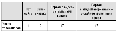 В современных условиях динамично развивается и размещение программ и даже ретрансляция эфира в Интернете. Еще осенью 2012 г. мы сталкивались с ситуацией, когда у некоторых телеканалов из нашего списка мы не могли найти даже сайта-визитки с минимальной информацией. Однако, уже заканчивая нашу работу летом 2013 г., мы снова прошлись по списку, и оказалось, что за короткое время сайты, насыщенные видео, появились у подавляющего большинства каналов (см. табл. 7). Кроме того, их ролики и собственные «каналы» можно найти на крупнейших видеохостинговых площадках, начиная с YouTube.