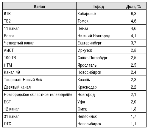 В табл. 10 представлены наиболее высокие показатели локальных полновещательных каналов по доле аудитории на местных рынках в тех городах, где проводились соответствующие исследования TNS.