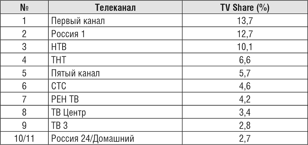 Таблица 7. Топ-10 эфирных телеканалов по объему аудитории, 2015 г. (Россия, Все 4+)