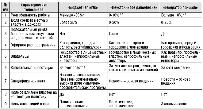 В российских регионах сегодня нет некоммерческих телекомпаний в европейском значении этого понятия: государственные и частные каналы одинаково борются за рекламную выручку. При этом специфика отечественной медиаэкономики позволила нам выделить три типа экономических моделей функционирования региональных полновещательных каналов. В случае «бюджетной иглы» – это отрицательная рентабельность и практически неизбежное субсидирование со стороны местных властей, которые в большинстве случаев являются еще и собственником этих компаний. Обратную ситуацию мы назвали моделью «генераторов прибыли», в которой в основном частные компании имеют достаточно высокую рентабельность (более 10 %), значительную рекламную выручку при низких контролируемых издержках и менее зависимы от различных вариантов бюджетного субсидирования. Промежуточный вариант мы назвали «неустойчивым равновесием». Однако в современных условиях с экономическими проблемами неизбежно столкнутся даже самые устойчивые игроки.