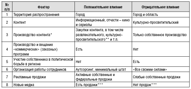На основании проведенных интервью и анализа экономических показателей региональных полновещательных телеканалов были выявлены внутренние факторы, положительно или отрицательно влияющие, с нашей точки зрения, на коммерческую успешность регионального полновещательного телевидения. Они представлены в табл. 14.