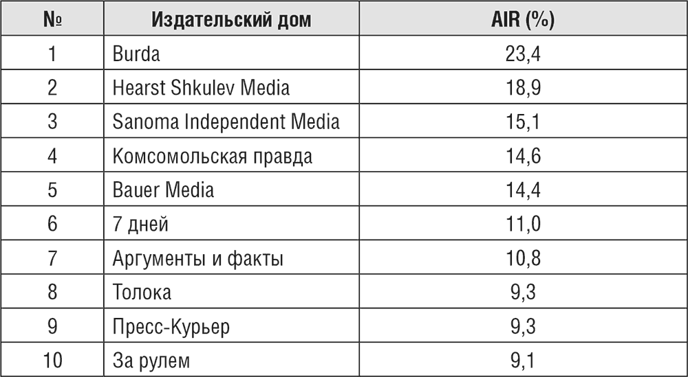 Таблица 8. Топ-10 издательских домов по совокупному объему аудитории, 2015 г. (Россия, Все 16+)