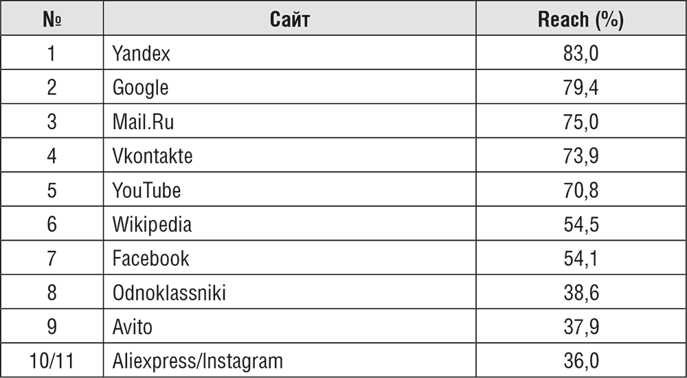 Таблица 10. Топ-10 сайтов российского Интернета по охвату, середина 2015 г. (Москва и Санкт-Петербург, 12-64)