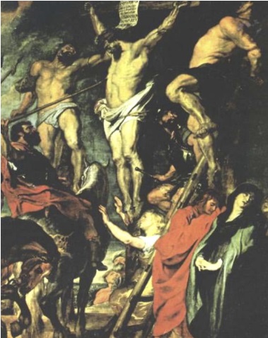 Римские стражники избили Иисуса, а затем, после издевательств и унижений, заставили тащить на себе крест до самого места казни. Его прибили к кресту и установили орудие казни на вершине Голгофы. После долгих мучений, продолжавшихся почти шесть часов, Иисус умер. Один из стражников пронзил ему грудь копьем, чтобы убедиться в смерти казненного.
