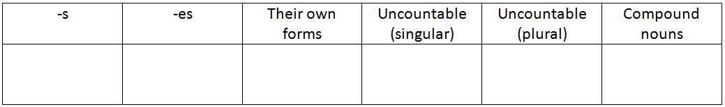 Exercise 3. Fill in the table using the words below according to their plural forms. (Заполните таблицу, используя слова ниже, в соответствии с образованием множественного числа у существительных.)