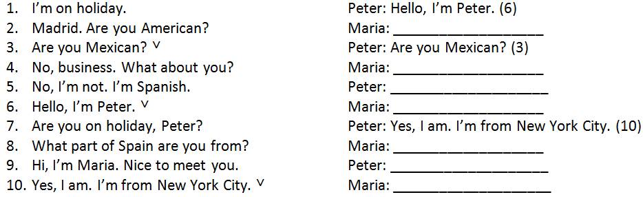 Exercise 6. Two tourists, Peter and Maria, are in a café. Put their conversation in the right order. (Два туриста, Питер и Мария, находятся в кафе. Расположите реплики их диалога в правильной последовательности)