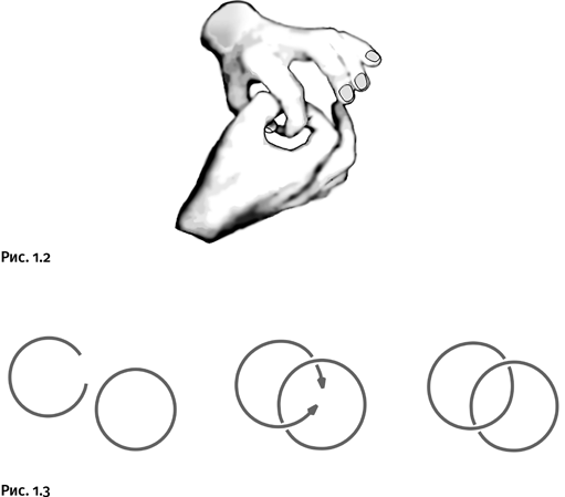 Естественно, вначале стояла цель соединить таким образом хотя бы два кольца. Проще всего изобразить такую конструкцию на пальцах, но если собирать ее из металлических колец, то необходимо потрудиться. Берем одно замкнутое кольцо и в него продеваем разомкнутое, затем разомкнутое кольцо замыкаем, звенья оказываются соединенными (рис. 1.2 и 1.3)