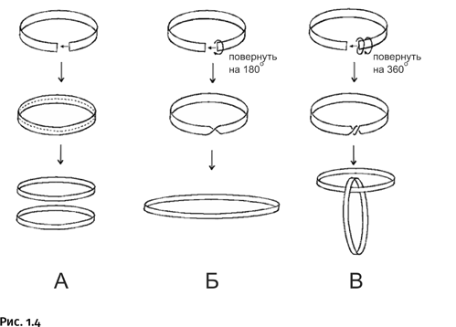 Один из возможных способов получения катенанов был подсказан детскими играми и фокусами со склеенными бумажными лентами. Вспомните игру детства. Возьмите бумажную ленту длиной приблизительно 0,5 м и шириной 4–5 см. Склейте ее концы, у вас получится кольцо (вариант А на рис. 1.4). Теперь разрежьте это кольцо ножницами по средней линии (она обозначена на рисунке пунктиром). У вас в руках окажутся два разъединенных кольца, что достаточно очевидно и без опыта.