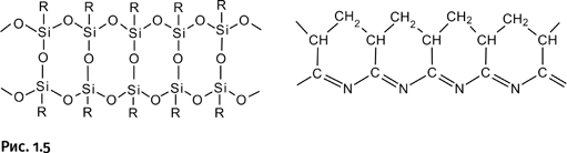 Таким образом, мы нашли один из способов решения задачи. Необходимо взять длинную молекулу, состоящую из двух цепей, соединенных поперечными сшивками. Внешне она будет напоминать ленту; такие молекулы существуют, они называются лестничными и получаются в определенных условиях из некоторых мономеров, например лестничный полисилоксан (А) и лестничный полиакрилонитрил (Б) (рис. 1.5).