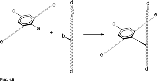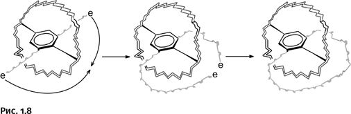 На следующем этапе происходит взаимодействие двух групп e, которые находятся на концах двух удлиненных цепей, присоединенных к бензольному кольцу (волнистые линии серого цвета). Ветви, на концах которых находятся группы е, имеют такую длину, чтобы реагирующие группы могли «дотянуться» друг до друга. В итоге образуется второе кольцо катенана (рис. 1.8).