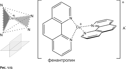 Самое главное при синтезе катенанов – расположить замыкающиеся кольца так, чтобы их плоскости были перпендикулярны: это облегчит замыкание одного цикла внутри другого. Но что может заставить их разместиться именно таким образом? В качестве «направляющего диспетчера» был использован катион меди Cu+, который легко образует комплекс с атомами азота двух молекул фенантролина. Связи, идущие от катиона меди (штриховые линии на рис. 1.13), направлены к вершинам мысленного тетраэдра (выделен точечными линиями), образуя две взаимоперпендикулярные плоскости (серые треугольники). Именно так располагаются около иона меди плоскости молекул фенантролина, играющих роль лигандов. Кстати, у катиона Cu+ обязательно имеется противоанион А– (например, Cl–), но при решении задачи мы не будем принимать его во внимание.
