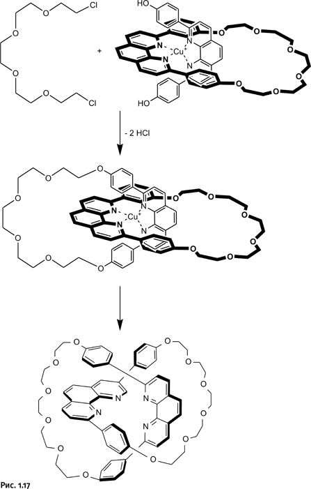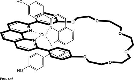 Однако катиону требуется в координационной сфере не два, а четыре атома N. Притянуть соседнюю такую же молекулу он не может, она громоздкая и не влезает внутрь первого кольца. Поэтому, когда введем в систему второй реагент, молекула которого не замкнута, катион Cu+, желая заполнить координационную сферу, втягивает второй реагент в кольцевую молекулу, как нитку в игольное ушко (для наглядности молекулы реагентов изображены линиями различной толщины). Именно этот хитроумный прием отсутствовал в методике, рассмотренной нами ранее. Катион Cu+, как уже было сказано, располагает фрагменты фенантролина взаимоперпендикулярно, что облегчает последующее замыкание второго кольца (рис. 1.16).