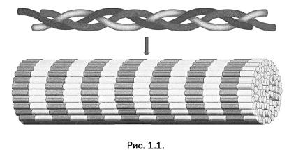 Строение кожи сегодня хорошо изучено. Ее основу составляет белок коллаген, имеющий вытянутую нитевидную структуру. Группы из трех сплетенных молекул укладываются параллельно, образуя коллагеновое волокно (рис. 1.1).