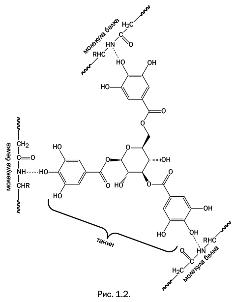 Одно из наиболее эффективных дубильных веществ, употреблявшихся в древние времена, содержалось в коре дуба, а также в чернильных орешках, образующихся иногда на дубовых листьях. Так появилось слово "дубление". Отвары коры или орешков добавляли в чан с вымоченной кожей. В более поздних исследованиях было выявлено и действующее вещество – танины. Эта группа соединений представляет собой связанные бензольные ядра, содержащие гидроксильные группы, то есть фрагменты -С6Н4-ОН. Пример одного из веществ этой группы показан на рис. 1.2.