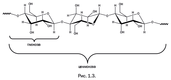 Предметы из целлюлозы постоянно окружают нас в повседневной жизни: 40–60 % древесины состоит из целлюлозы, в хлопковой вате ее содержание – 96–98 %, а ворсинки тополиного пуха – это практически чистая целлюлоза. Линейная полимерная молекула целлюлозы собрана из циклических молекул глюкозы (рис. 1.3), молекулярная масса – от 400 000 до 2 млн, а сама молекула напоминает бусы.