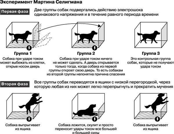 В качестве примера приведем описание одного эксперимента Селигмана. Было три клетки, в которых находилось по три собаки. В первой клетке имелась четкая петля обратной связи – собаки получали разряд тока, но если они нажимали на кнопку, ток отключался. Во второй клетке система обратной связи была нарушена – в клетку подавали ток, и когда собаки нажимали на кнопку, ток то отключался, то продолжал их бить. Собаки не понимали, на что реагировать. В третьей клетке находилась контрольная группа собак, которых не дрессировали, они просто жили в клетке. Затем происходило следующее: собак из первой и второй клеток пересаживали к собакам из третьей и пускали ток. Собаки из первой группы нажали на кнопку и выбежали из клетки. Собаки из третьей группы, увидев, как убегают их собратья из первой группы, выбежали вслед за ними. А собаки из второй группы упали на пол и стали жалобно выть. Это и есть состояние выученной беспомощности, когда существует цель, но достичь ее мы не можем, потому что не знаем, как реагировать на внешние стимулы.