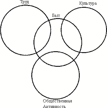 Новая отрасль междисциплинарных исследований, шумно номинированная в истекшее десятилетие как новейшее изучение «повседневности» или «истории повседневности», на заре нового тысячелетия становится важным направлением в системе гуманитарного знания [Пушкарева 2004; 2010; Орлов 2010; Фицпатрик 2001; Лебина 1999; Моисеева 2008; Зарубина 2011; Касавин, Щавелев 2004]. Между тем оказывается, что в бесконечном потоке публикаций, посвященных повседневности, трудно найти аналитически взвешенное определение ее дефиниции, позволяющей соотнести основные сферы повседневности с проблематикой и со сферами образа жизни. Не предаваясь утомительным выборкам цитат, раскрывающих смысловое содержание каждого феномена, ограничимся рабочей схемой № 1. В ней заштрихована часть круга, означающего «быт» и «вторгающегося» в пространство трех других кругов – «труд», «культура» и «общественная активность», означает проблематику предметной области повседневности, если при этом к каждому кругу подходить как к статическому, так и динамическому явлению.