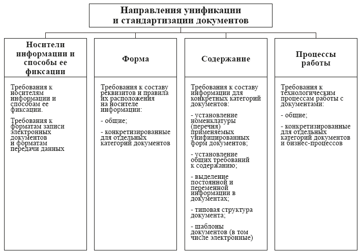 Можно выделить несколько основных направлений унификации и стандартизации управленческих документов как на бумажном носителе, так и электронных – это сами носители записи, способы фиксации информации, форма, содержание и технологические процессы работы с документами (рис. 3). В связи с расширением применения электронных документов в управлении требуется особое внимание к унификации носителей информации и способов ее фиксации, включая установление требований к форматам записи файлов документов, в том числе для задач их долговременного хранения, и форматам передачи данных.