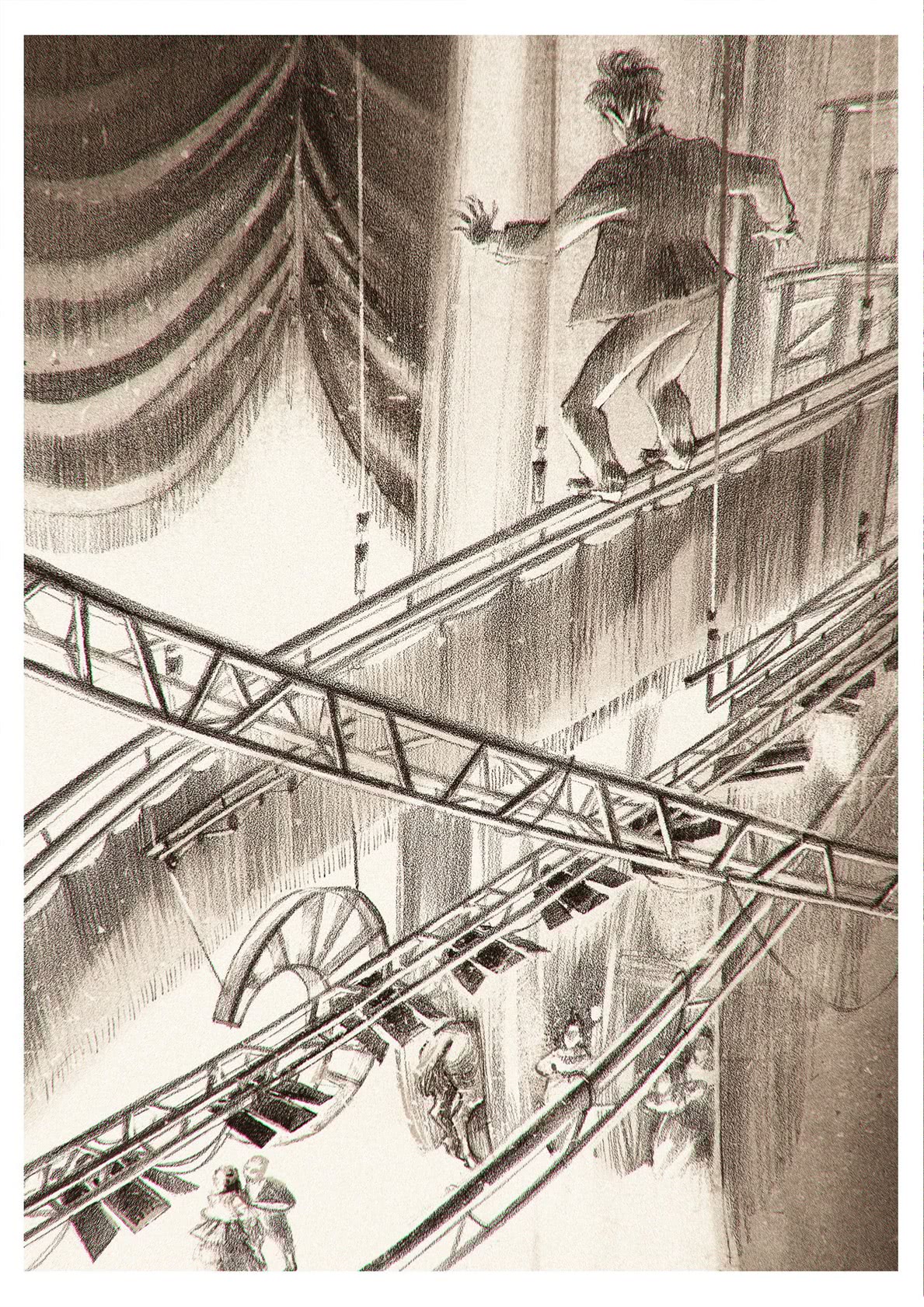 Зато кулисы пересекали деревянные лестницы. Пока было, за что зацепиться, высота была не страшна. Бывший палубный матрос забрался повыше. Ступил на балку. Выпрямился. И понял, что назад пути нет. У него безбожно тряслись колени.