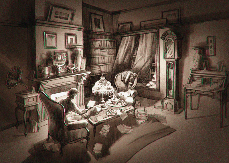 На журнальном столе между двух кресел горела лампа, стояла пепельница и валялась корреспонденция. Тут же находился серебряный поднос с кофейной машиной. И книги. Открытые, наспех заложенные самыми неожиданными предметами вроде вилки, апельсиновой кожуры, вечернего галстука или резинки для носков, они лежали на диване и на бюро, на столике рядом с граммофоном и поверх вазы, украшавшей часы на полу. На ковре за креслами сомневались в своей надежности два подобия Пизанской башни.