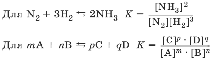 Закон действия масс: отношение произведения концентраций продуктов реакции к произведению концентраций исходных веществ (все концентрации указывают в степенях, равных их стехиометрическим коэффициентам) есть постоянная, называемая константой равновесия.