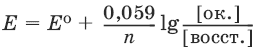 где Е0 – стандартное значение окислительно-восстановительного потенциала; n – число переданных электронов; [восст. ] и [ок. ] – молярные концентрации соединения в восстановленной и окисленной формах соответственно.