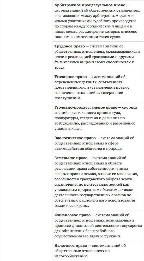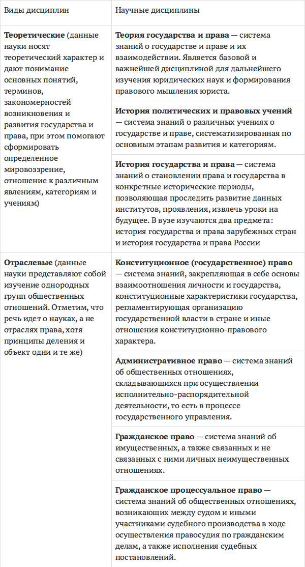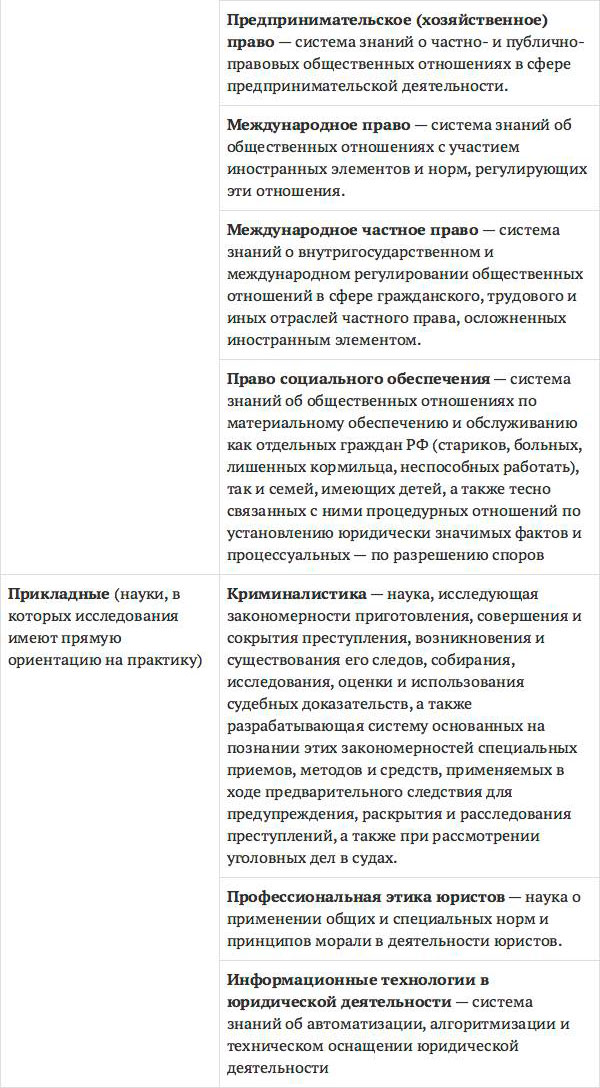 В вышеприведенном перечне наук мы привели определения только тех наук, которые прямо предписываются к изучению в вузе в качестве дисциплин Стандартом образования бакалавра. Это действительно основные науки, входящие в систему юриспруденции, но их перечень можно дополнить, например, философией права (теоретическая наука), семейным правом (отраслевая), криминологией, юридической техникой, юридической психологией, юридической социологией, сравнительным правоведением, юридической статистикой (прикладные науки). Вуз, как правило, в рамках вариативной части образовательной программы добавляет к изучению ряд дополнительных дисциплин.