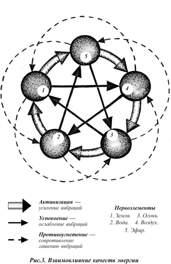 Первоэлементы (земли, воды, огня, воздуха, эфира) – определяют качества энергии (легкость, тяжесть и т. д.), ее цвет и тип реакции при взаимодействии. Именно они определяют вибрацию (пульсацию) энергии, так как могут увеличивать или уменьшать свой объем до 100 раз.