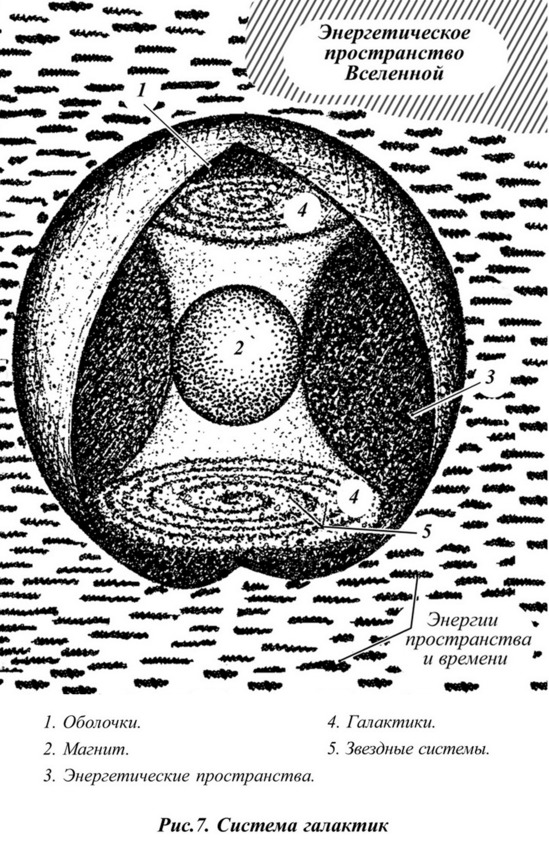 Каждое мироздание – состоит из оболочек, магнита и миллиардов вселенных. Каждая Вселенная – состоит из оболочек, магнита и миллиардов систем галактик. Каждая система галактик – состоит из оболочек, магнита, 2—3 галактик и миллиардов звездных систем.