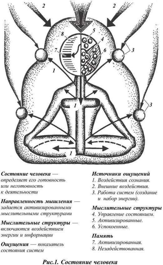 Состояние человека – итоговый (суммарный) режим работы сознания и всех систем, субъективно воспринимаемый через направленность мышления, комплекс ощущений и диапазон, доступных проявлений. Способности управления состоянием – один из основных показателей развития человека.