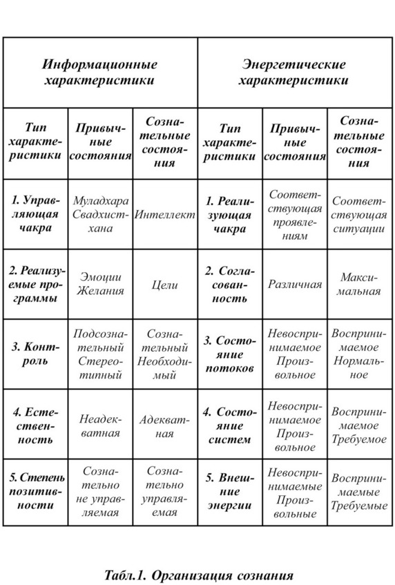 Каждое состояние – на уровне сознания характеризуется следующим: 1. Мыслительные структуры, соответствующие состоянию, – активизируются, становятся управляющими, не соответствующие – успокаиваются. 2. Внешняя память – настраивается на распознавание, внутренняя – на синтез рабочих энергий.