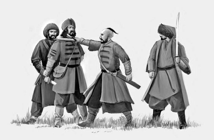 Кропивенской казак Ондрюшка Щекуров: ростом невелик, волосом беловат, уса и бороды нет. А платья на нем: кафтан бел сермяжной, завяски на нем ременные, да кафтан бараней наголной; шапка черкаская с пухом.