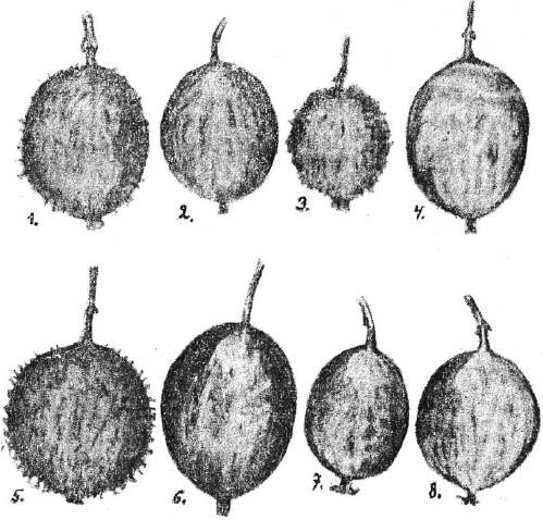 Рис. 6. Сорта крыжовника 1 – изумруд; 2 – бутылочный зеленый (зеленая ива); 3 – белый плодовитый; 4 – удивительный (красно-бурый исполинский); 5 – пасторский (Авенариус); 6 – красный яйцевидный (веселый рудокоп); 7 – красный призовой (рычащий лев); 8 – виноградный желтый.