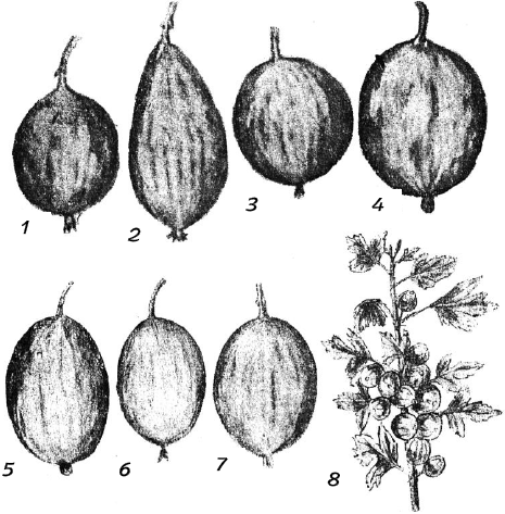 Рис. 5. Сорта крыжовника: 1 – зеленый скороспелый; 2 – примула; 3 – желтый скороспелый (желтый лев); 4 – исполинский желтый (один за два); 5 – промышленный; 6 – зеленый исполинский; 7 – зеленый бархатный (улыбающаяся красавица); 8 – белый триумф.