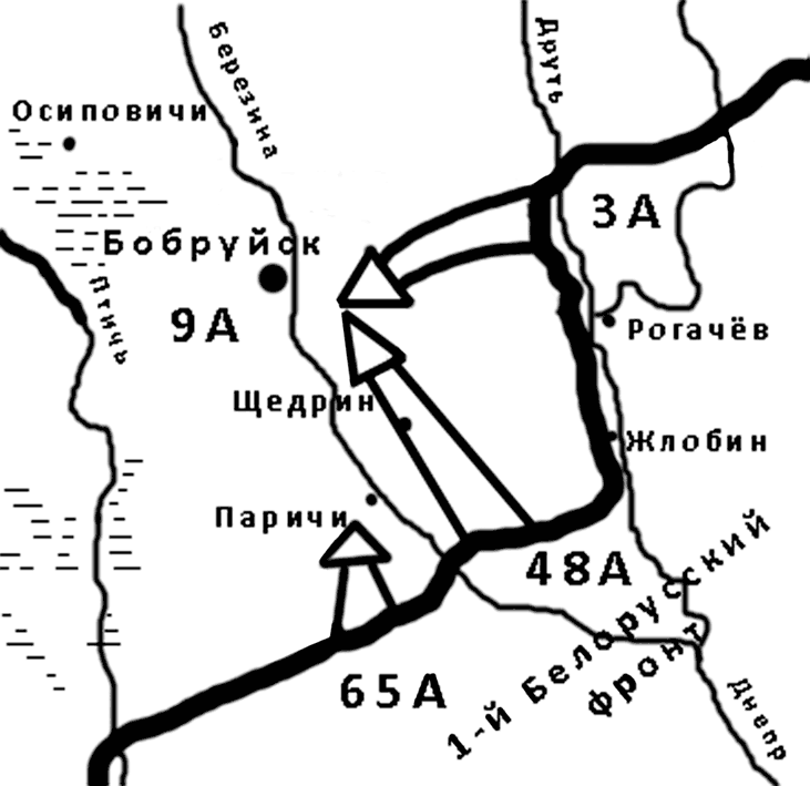 «2. Цель наступательной операции – разгромить жлобинскую группировку противника и главными силами правого крыла фронта выйти на рубеж: Хомичи, Подселы, Виленки, Новгородок, Пацова слобода, Козулич, Морховиичи, Гута, р. Березина, м. Паричи, Кнышевичи, Чернин, Петровичи.
