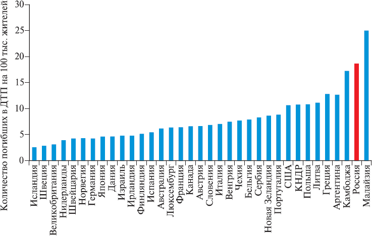 Согласно стандартам, определенным регулярными докладами IRTAD,[7] OЭСР, ВОЗ и общепринятым в международной практике, уровень безопасности дорожного движения (далее – БДД) в той или иной стране определяется, прежде всего, количеством погибших в дорожно-транспортных происшествиях (road fatalities), а также рядом производных (приведенных) показателей. Используются также многие другие показатели макроскопического уровня (т. е. по стране в целом), в том числе число пострадавших, общее количество и тяжесть последствий ДТП, а также декомпозиция макропоказателей на уровень отдельных городов, дорог, регионов, специфических групп участников дорожного движения. Далее мы будем использовать главным образом макропоказатели, основанные на количестве погибших в ДТП.